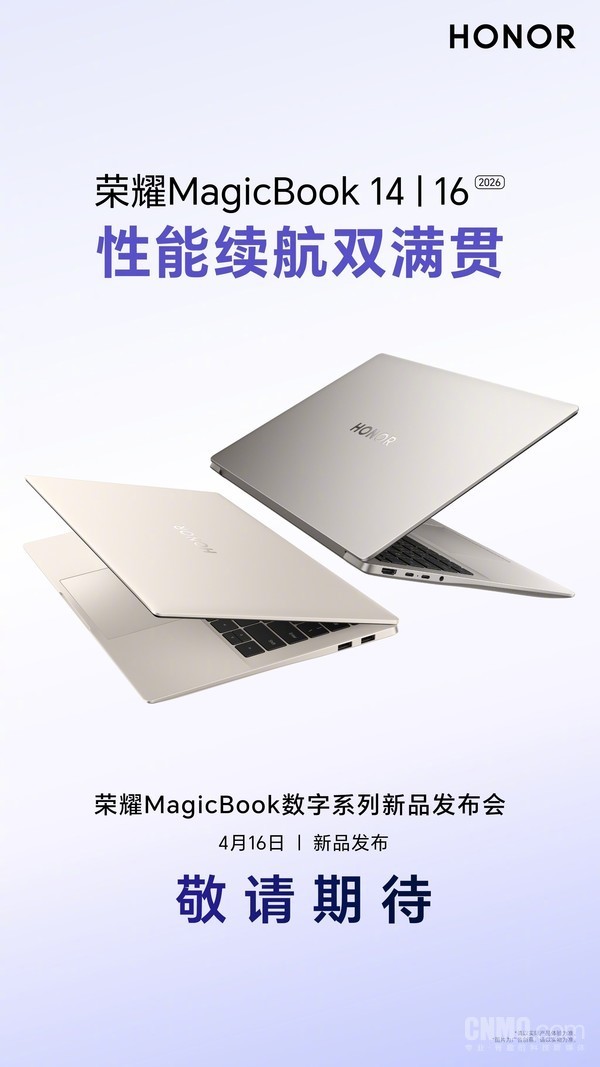 【CNMO科技消息】4月7日,荣耀官方正式宣布,荣耀MagicBook数字系列新品发布会将于4月16日举办。届时,荣耀MagicBook 14/16 2026款将发布。