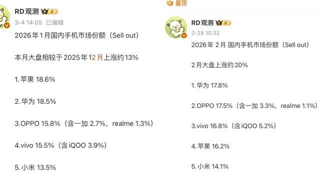 今天分享的是2026年2月国内手智能机市场份额,因为国补和春节等因素,1月和2月份大盘环比增长还是挺明显的,其中2月份环比增长约为20%。在榜单排名方面,小米以14.1%的份额再次排名第五,苹果跌出榜单前三名,国产厂商在春节期间还是挺给力的。OPPO排名第二,第一名意料之中,它就是近期成绩很出彩的华为。