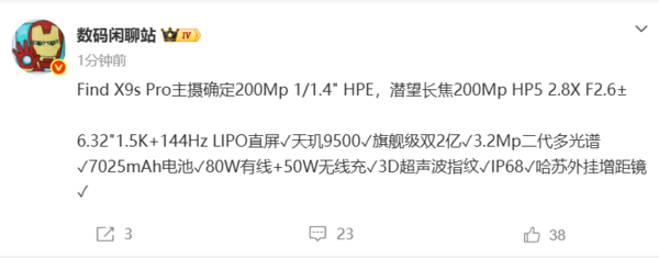 【CNMO科技消息】4月7日,博主“数码闲聊站”曝光了OPPO Find X9s Pro的配置信息。作为OPPO Find X9系列中的“小屏担当”,OPPO Find X9s Pro将在6.32英寸的机身内塞进了双2亿像素哈苏影像、天玑9500旗舰芯片以及超7000mAh大电池,堪称新一代“旅拍神器”。这款定位“小屏影像旗舰”的新机将于4月21日19:00正式发布。